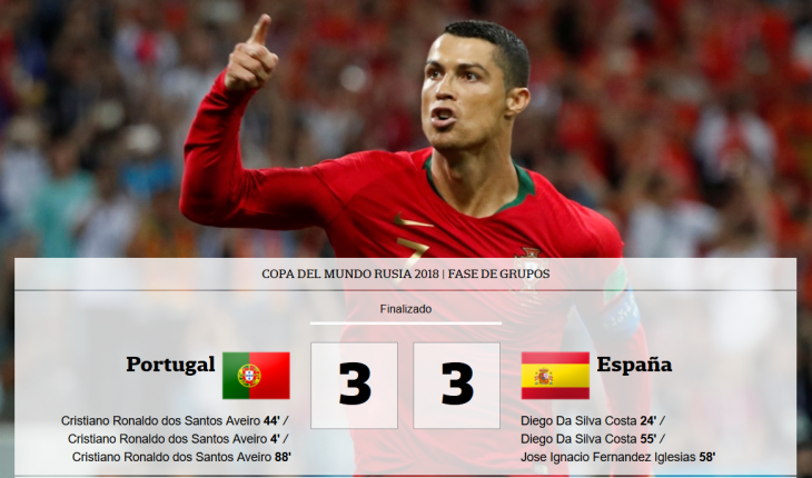 España y Portugal empataron 3-3 en un partidazo este viernes por la primera fecha del Grupo B del Mundial Rusia 2018. Cristiano Ronaldo (uno de penal, otro de tiro libre) anotó los tres goles del elenco luso; Diego Costa, en dos ocasiones, y Nacho convirtieron para el equipo dirigido por Fernando Hierro.