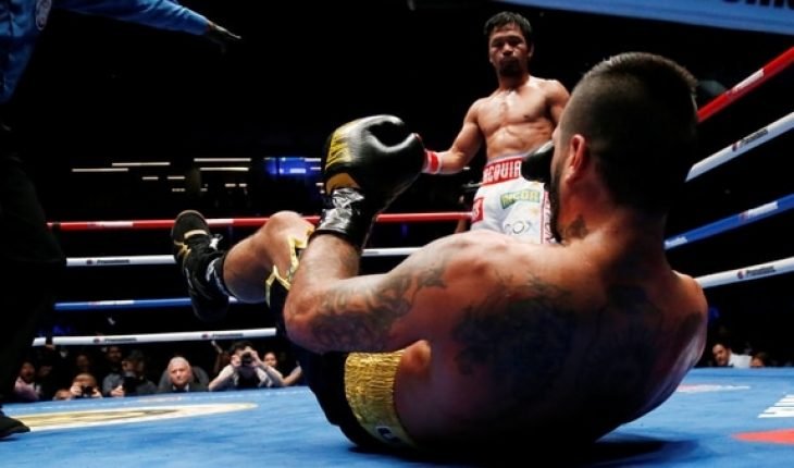 El tercer round fue el primero en el que el histórico filipino le hizo conocer la lona al argentino con un zurdazo letal al mentón. En el quinto volvió a caer, pero esta vez de manera deliberada. Puso una rodilla en el piso y alegó una dolencia más allá de no haber recibido un impacto en ese momento.