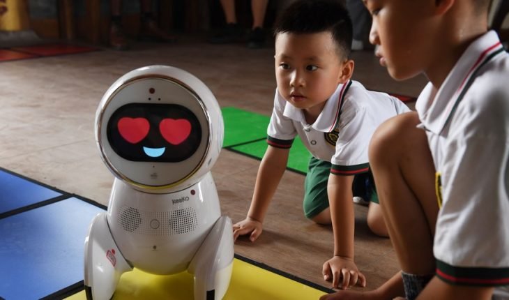 En la escuela infantil Yiswind, en las afueras de Pekín, los niños escuchan religiosamente al pequeño profesor androide mientras cuenta, con voz infantil, la historia de un príncipe que se perdió en el desierto.