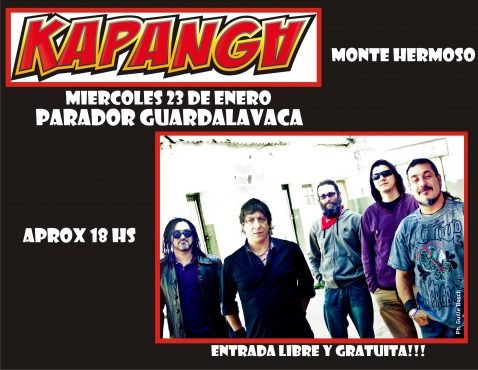 El próximo recital en Monte Hermoso será nuevamente en el parador Guardalavaca, el miércoles 23 a las 19 horas, donde el escenario se inundará de rock, reagge, cuarteto y ska, de la mano de los quilmenios de Kapanga en un evento para disfrutar de forma libre y gratuita.