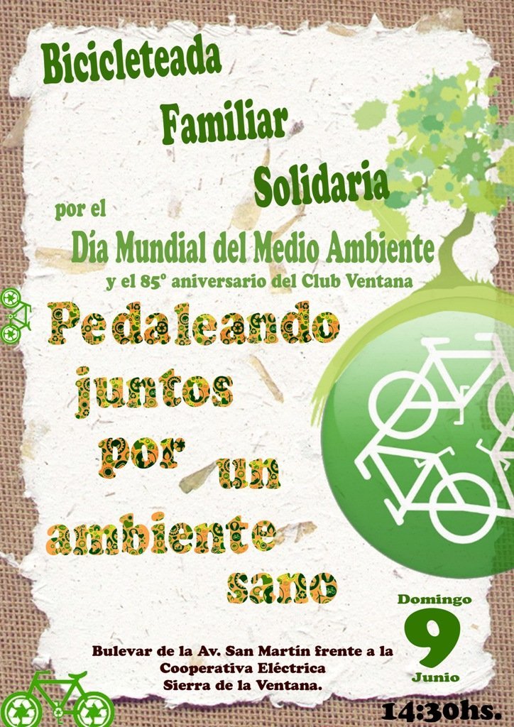 La ONG Ambiente Comarca y el Club Atlético Ventana los invita a participar junto a sus hijos de la Bicicleteada Familiar Solidaria por el Día Mundial del Medio Ambiente y del Festejo de los 85 Años del CAV, el día domingo 9 de junio.