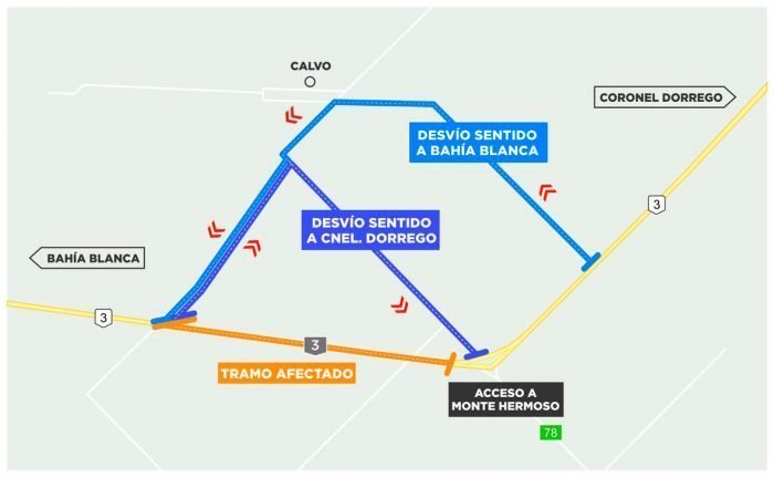 - Sentido Monte Hermoso – Bahía Blanca: Desde la rotonda de intersección de la RP 78 (acceso a Monte Hermoso ) y la Ruta Nacional N° 3 hasta el Km- 603. Allí tomar el camino vecinal por 9 km hasta retomar la circulación por RN 3 en el Km. 610.