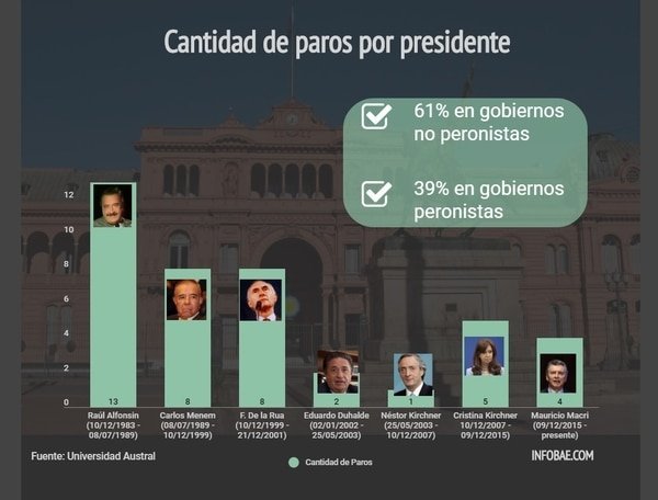 Según un informe realizado por la Escuela de Gobierno de la Universidad Austral, se contabilizaron 41 paros generales desde el 10 de diciembre de 1983, o sea, cada 312 días.