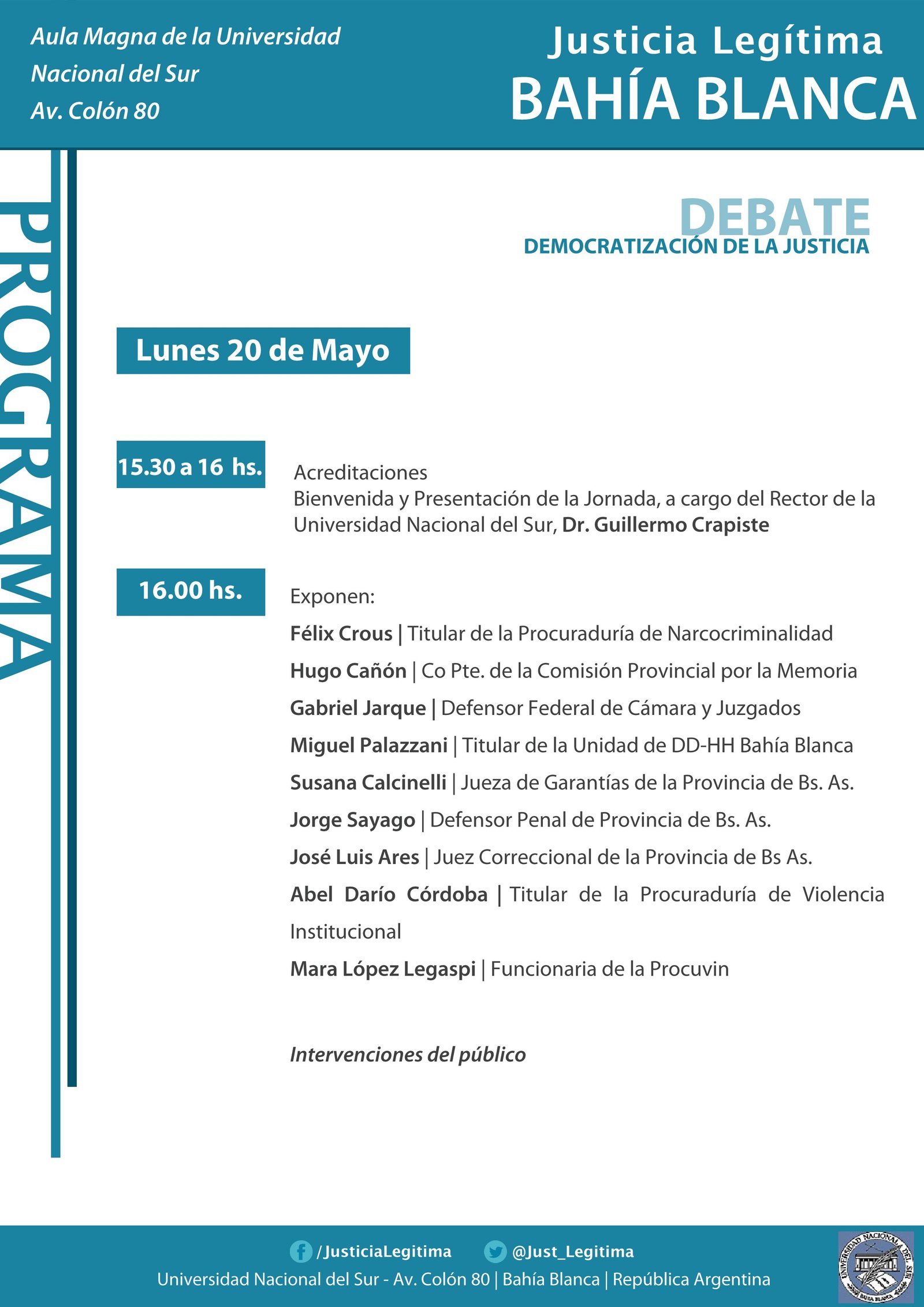 Una nueva jornada de Justicia Legítima se desarrollará hoy a las 15.30hs en el Aula Magna de la UNS, Av. Colón 80.