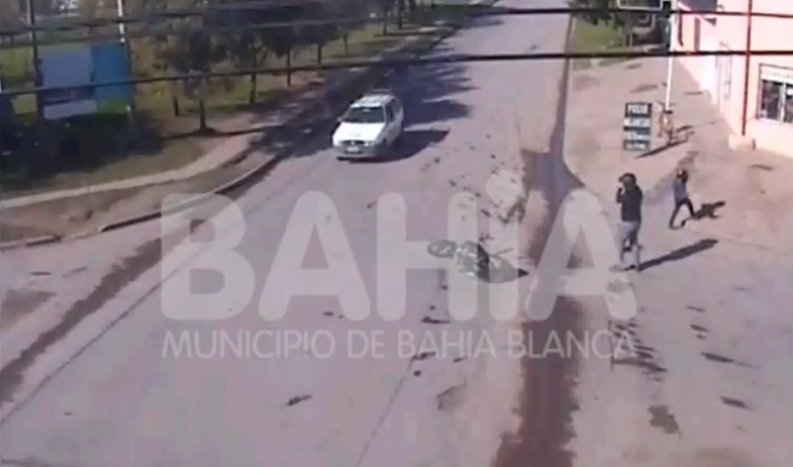 El sábado, en horas del mediodía, desde el Centro Único de Monitoreo (CeUM) seobserva el instante en que una moto circulando con un menor de acompañante, trata de evitar chocar contra un automóvil en Pampa Central y Maldonado.