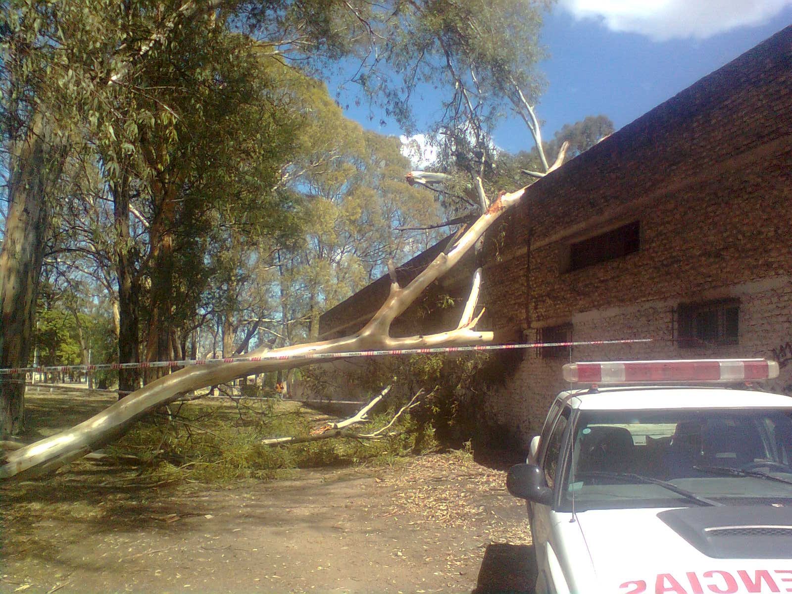 Defensa Civil informó que al llegar al lugar se constató la presencia de parte del árbol apoyado contra el paredón de la escuela, mientras que otra parte de la planta se encontraba sobre el techo.