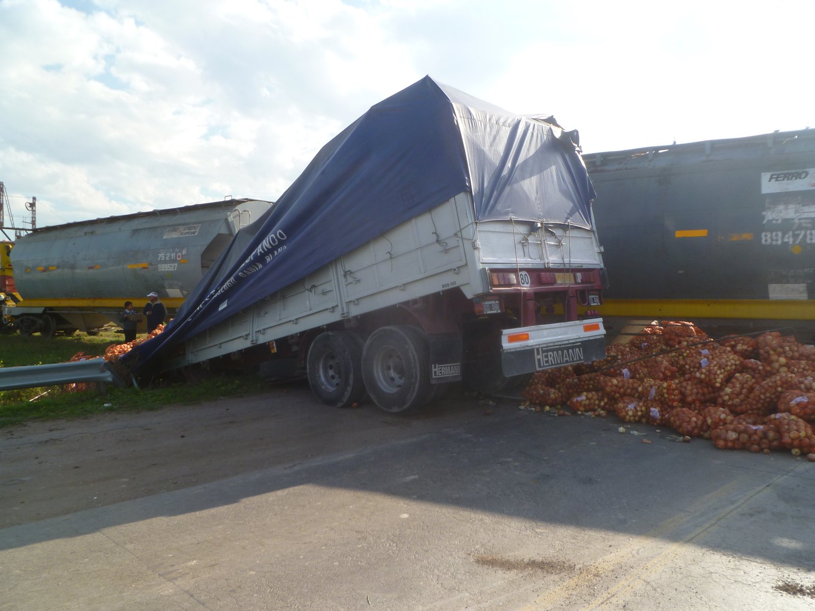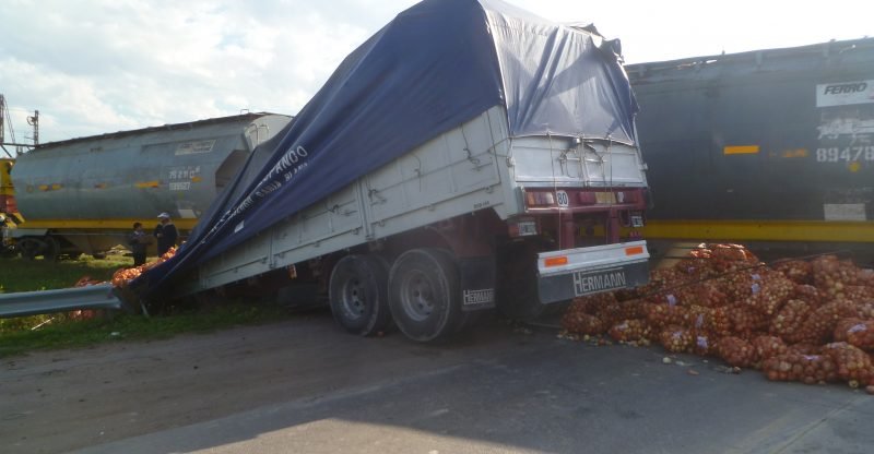 Un verdadero milagro se produjo esta mañana, después de que un tren arrollara a un camión cargado de cebollas en el paso a nivel del Camino Sesquicentenario, donde no hay barreras.