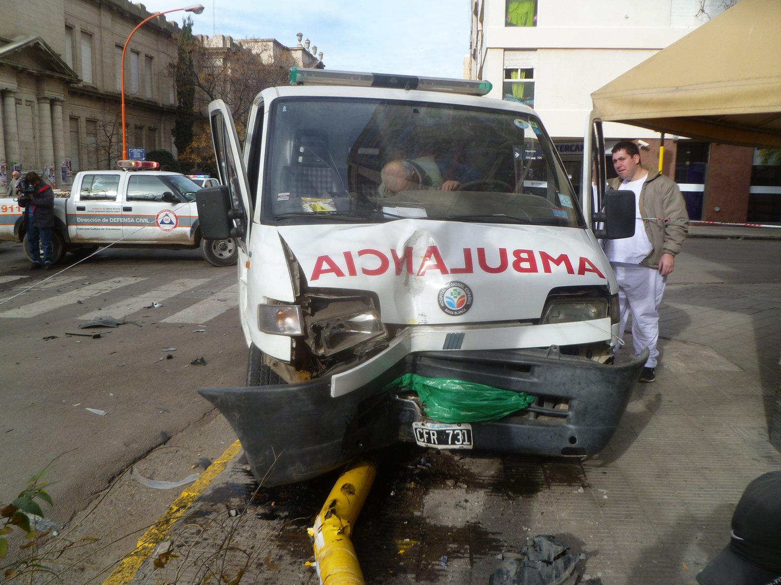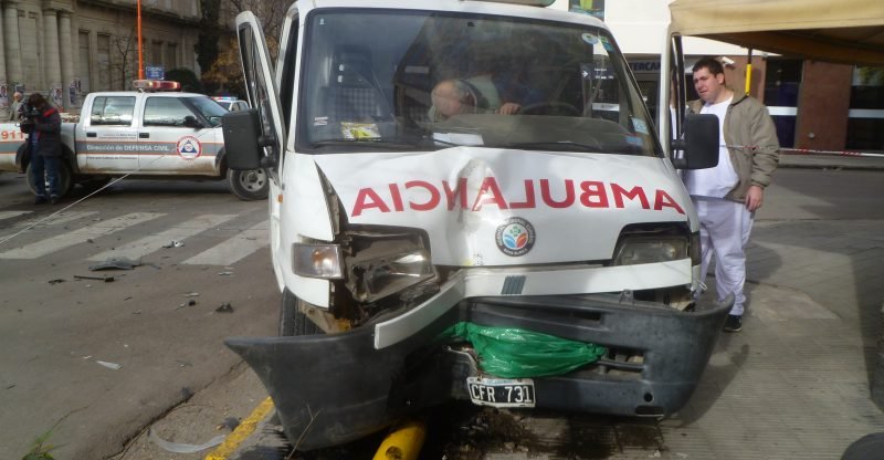 Producto del impacto, la ambulancia terminó colisionando el semáforo y columna de alumbrado situada en la intersección, mientras que el automóvil finalizó su recorrido sobre la calle Vieytes, en la entrada del colegio Don Bosco.