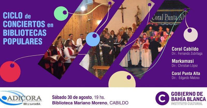 Este sábado 30, a las 19 horas, en la biblioteca Mariano Moreno de Cabildo se realizará un encuentro coral en el marco del Ciclo de Conciertos en Bibliotecas Populares que organiza ADICORA, la asociación de directores de coros, y que cuenta con el auspicio del Instituto Cultural.