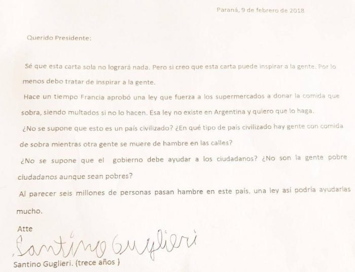 El 9 de febrero Santino Guglieri le mandó un fax al presidente Mauricio Macri. En el texto le contaba una idea que funcionó en Francia: “Hace un tiempo, aprobaron una ley que fuerza a los supermercados a donar la comida que sobra, los multan si no lo hacen. Esa ley no existe en la Argentina y quiero que lo haga”, escribió. El reclamo y sugerencia del joven tenían por objetivo ayudar a la gente. “Al parecer seis millones de personas pasan hambre en este país, una ley así podría ayudarlas mucho”. Dos meses después llegó la respuesta. El Presidente lo invitó a la Quinta de Olivos para conversar.