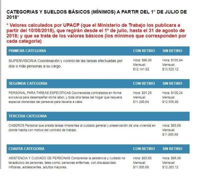 De esta manera, el salario para la categoría más numerosa, la quinta, que comprende al personal que realiza “tareas de limpieza limpieza, lavado, planchado, mantenimiento, elaboración y cocción de comidas y, en general, toda otra tarea típica del hogar”, quedará, desde el 1 de julio hasta el 31 de agosto, en $80,08 la hora “con retiro” y $85,68 “sin retiro”.