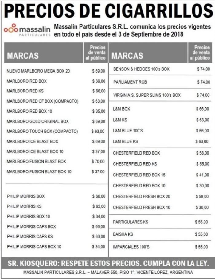 La nueva lista de precios muestra un aumento de entre $ 3 y $ 5 por etiqueta. Por ejemplo, el Marlboro Box de 20 unidades pasará a costar $ 69 (valía $ 66) y la versión KS costará $66.