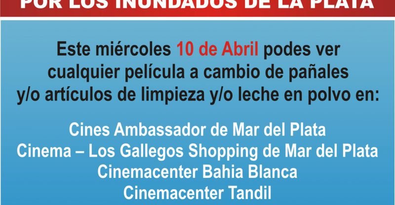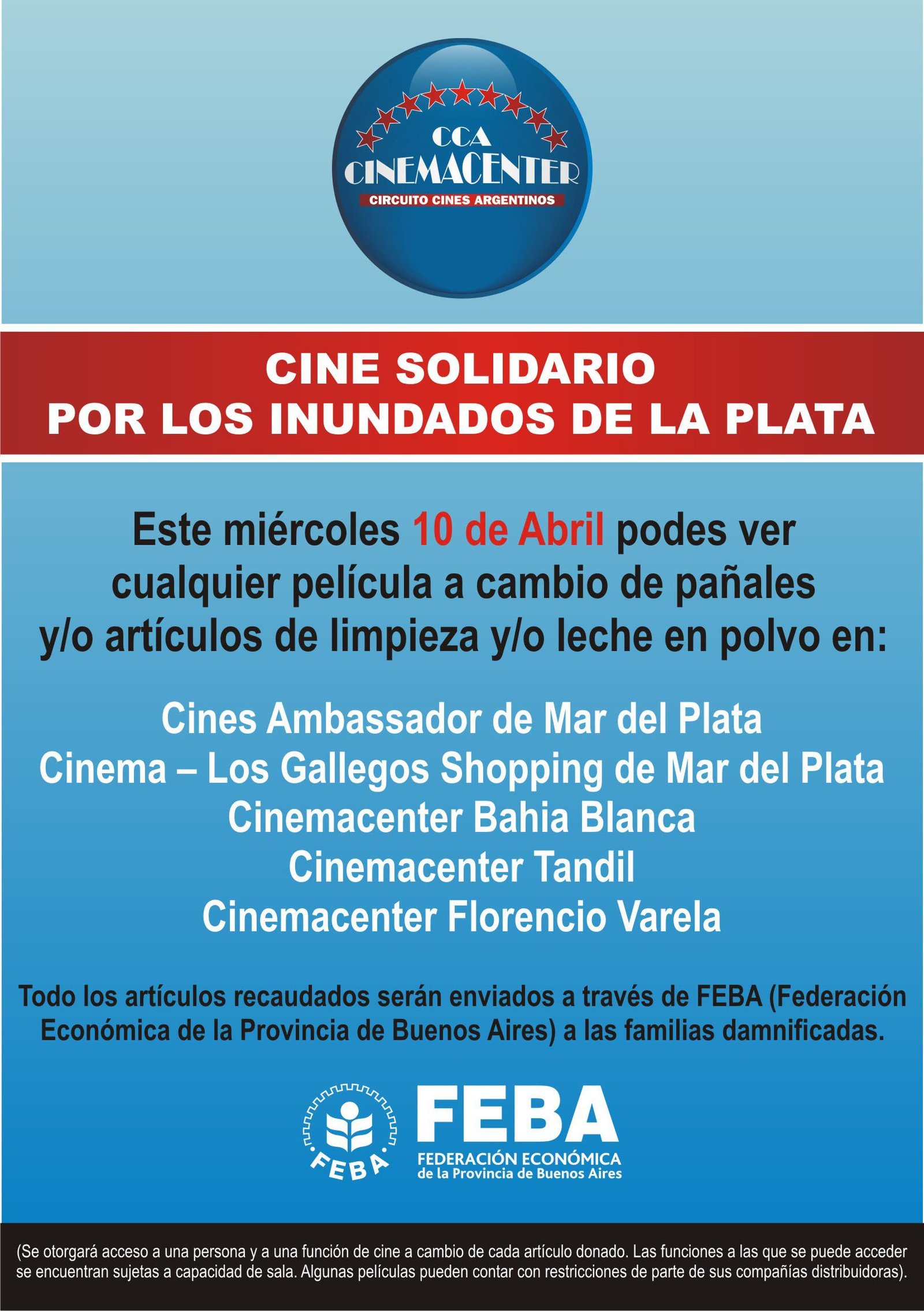 En conjunto con FEBA (Federación Económica de la Provincia de Buenos Aires) y con el apoyo y compromiso de las distintas distribuidoras cinematográficas del país, Cinemacenter ha organizado para el próximo miércoles 10 de abril en la mayoría de las salas de la Provincia de Buenos Aires una jornada destinada a recolectar leche en polvo, pañales y artículos de limpieza destinados a la donación de los miles de damnificados en las inundaciones de la semana pasada en La Plata.