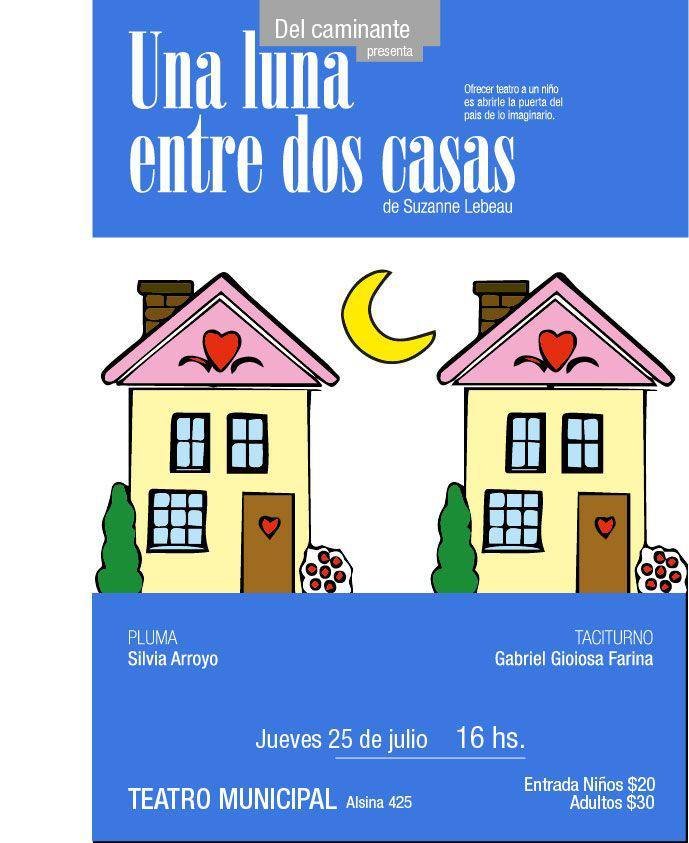 El espectáculo para niños y grandes “Una luna entre dos casas”, de Suzanne Lebeau, una de las dramaturgas más sobresalientes de la escena internacional para niños y adolescentes, realizará su última función el jueves 25 de julio a las 16 hs. en el Teatro Municipal, Alsina 425, Bahía Blanca, durante las vacaciones de invierno.