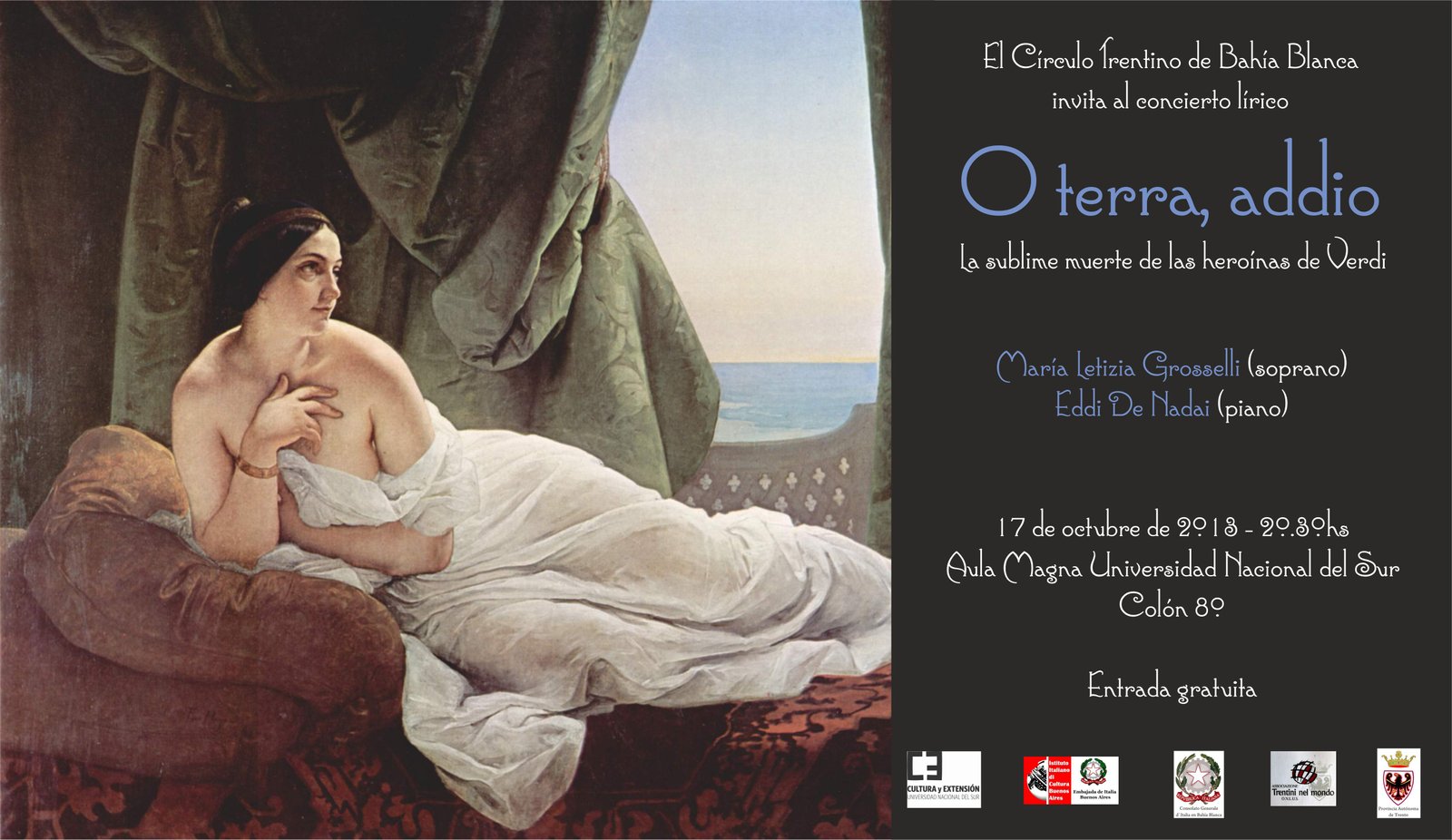 El Círculo Trentino de Bahía Blanca invita al concierto lírico que tendrá lugar hoy, a las 20.30hs., en el Aula Magna de la Universidad Nacional del Sur (Av. Colón 80) con la presencia de la soprano italiana María Letizia Grosselli y del pianista Eddi De Nadai. Interpretarán un programa dedicado a algunas de las figuras femeninas de la ópera de Giuseppe Verdi.